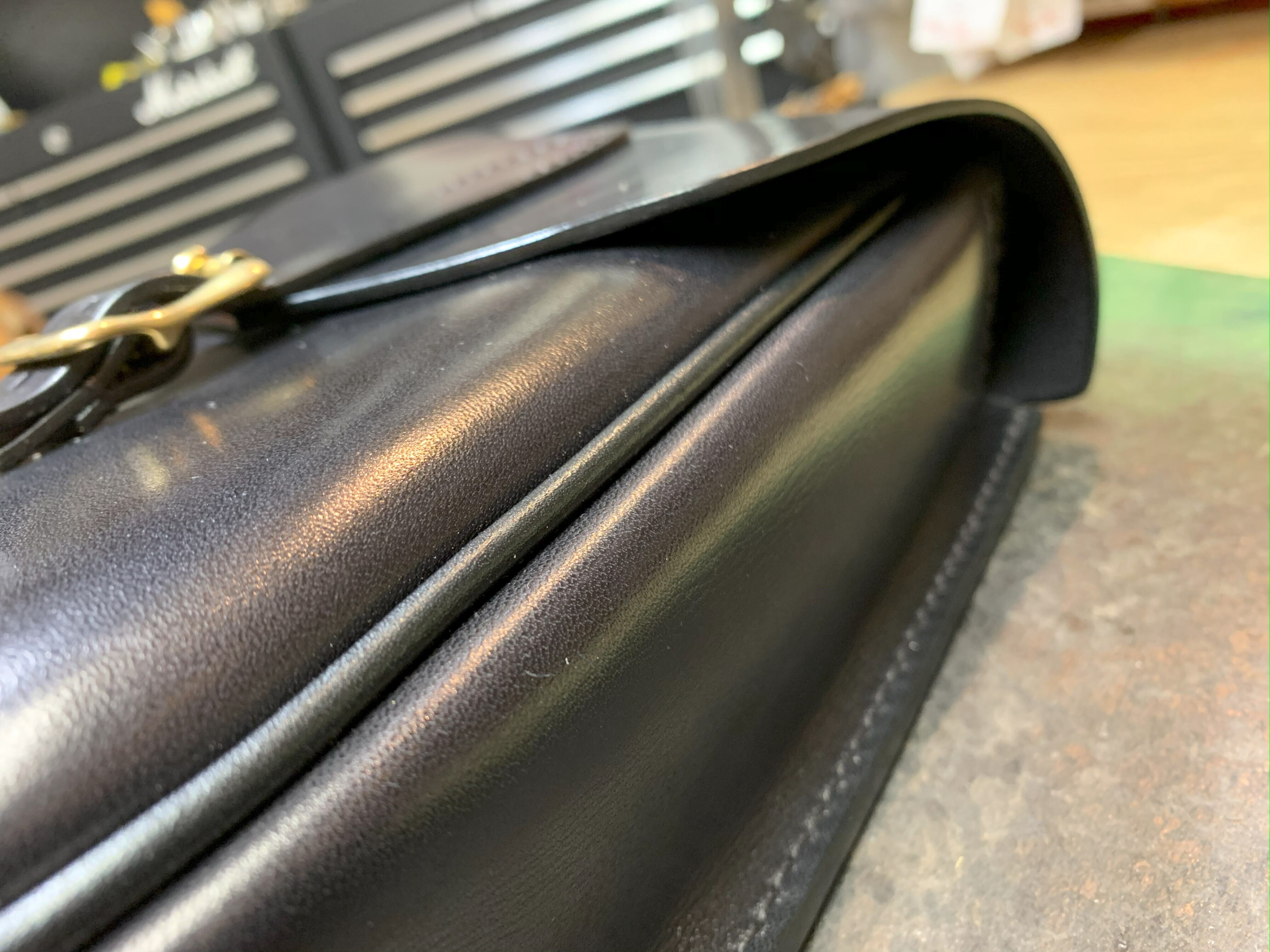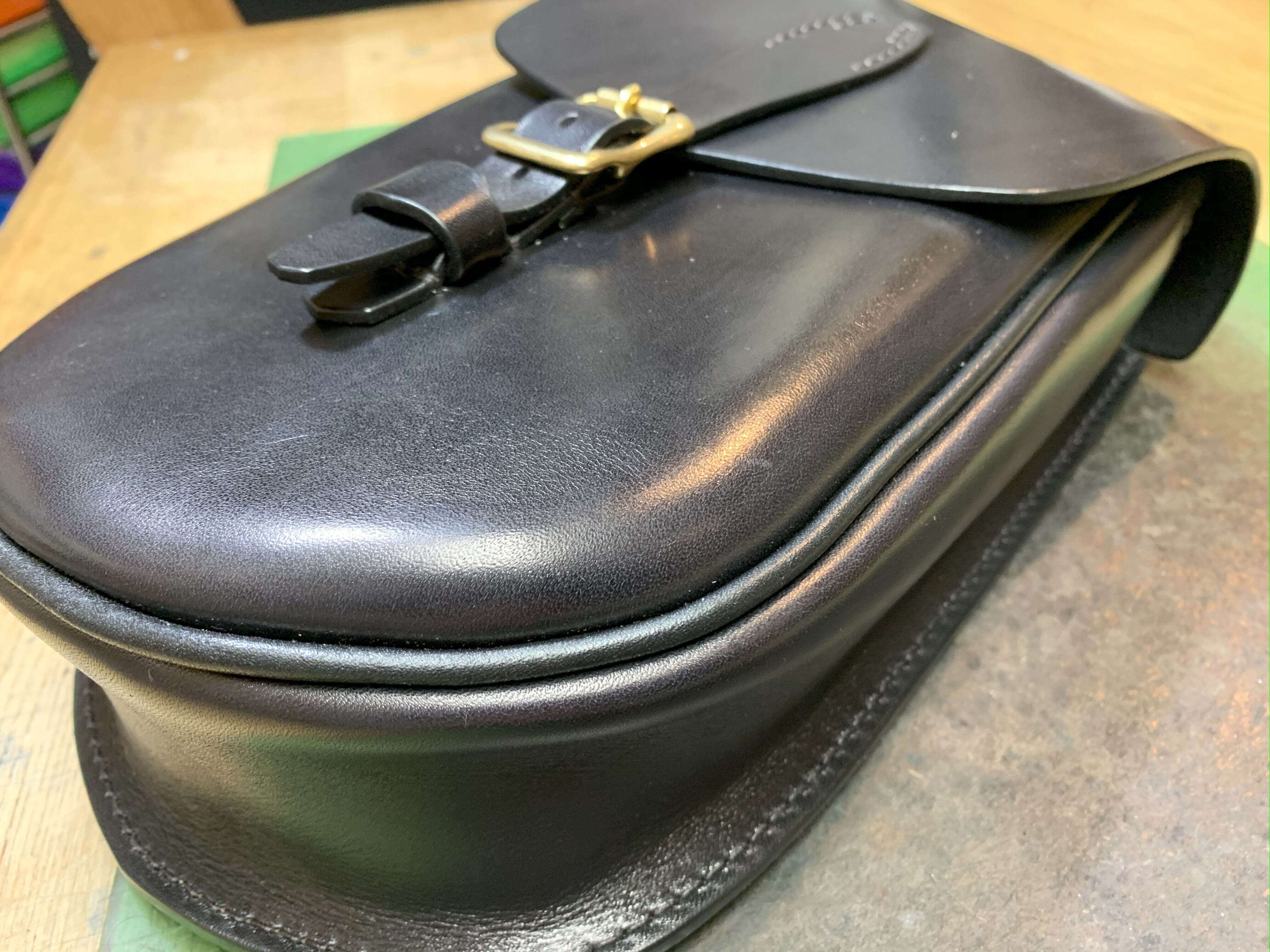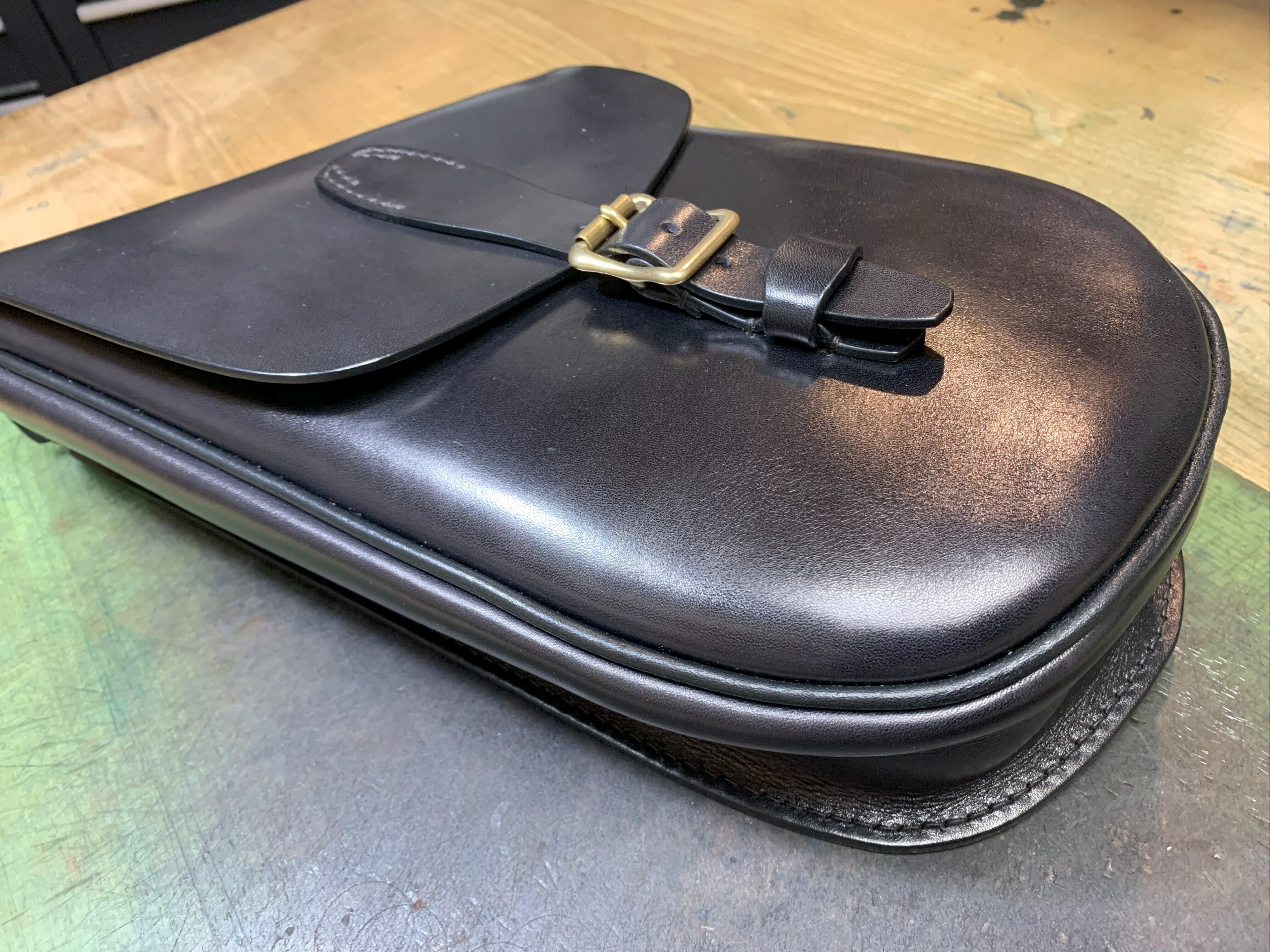 通常極厚の革で製作するところですが、こちらは3mm厚をベースに製作し、「マチの取り方」「パーツ構成」「パイピング」などの複合技でしっかりと形を保っています。