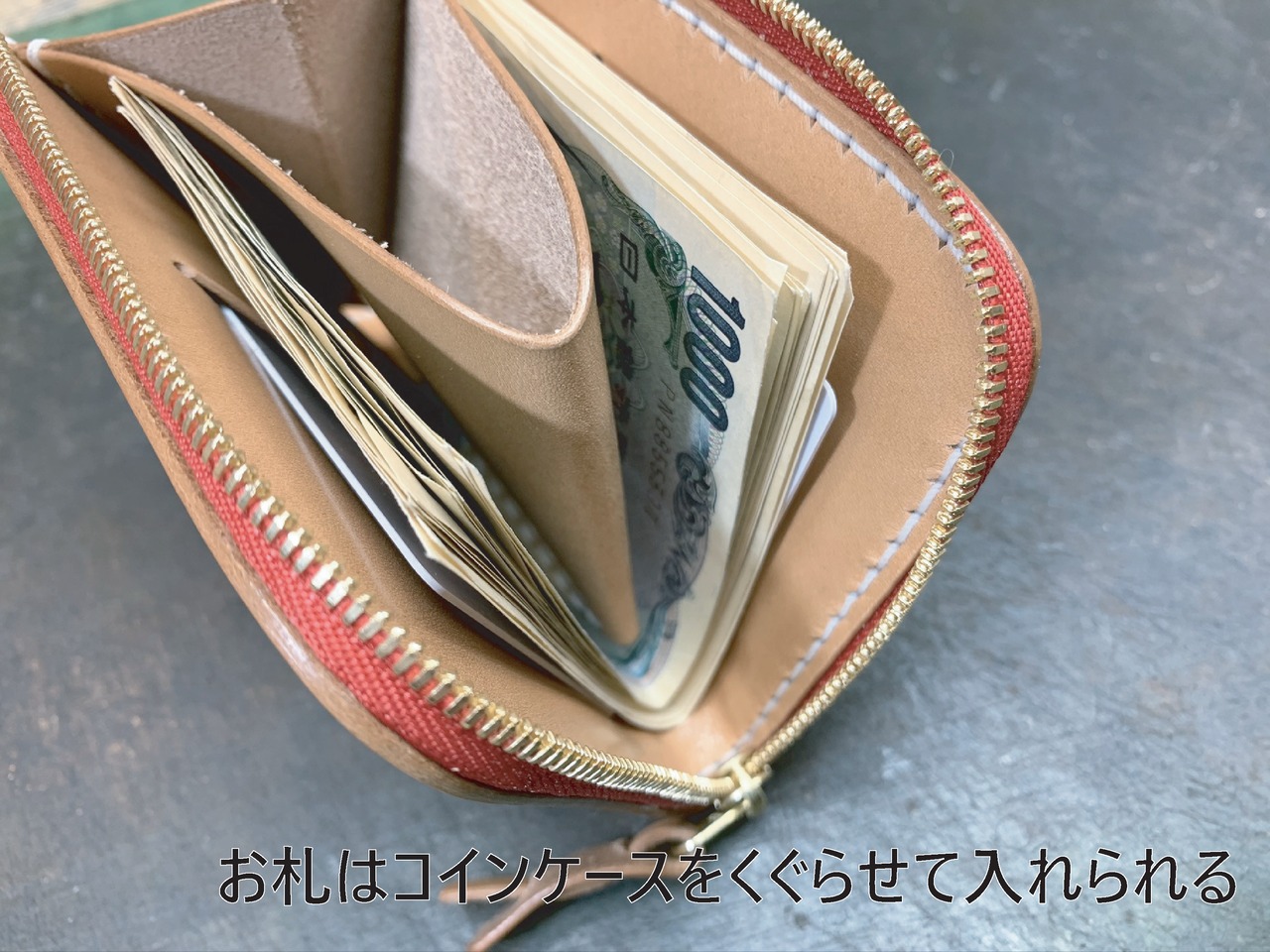 →コインケース下部に1枚革を挟むことで小銭がギュッとなる事を防いだ