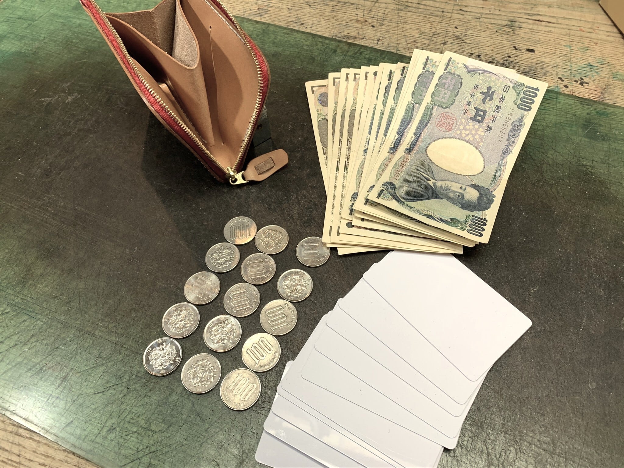 お札13~15枚、プレスチックカード×10枚、小銭15枚を収納してもスッキリするのはコンパクトながらパーツ構成と大きさに余裕を持たせているから