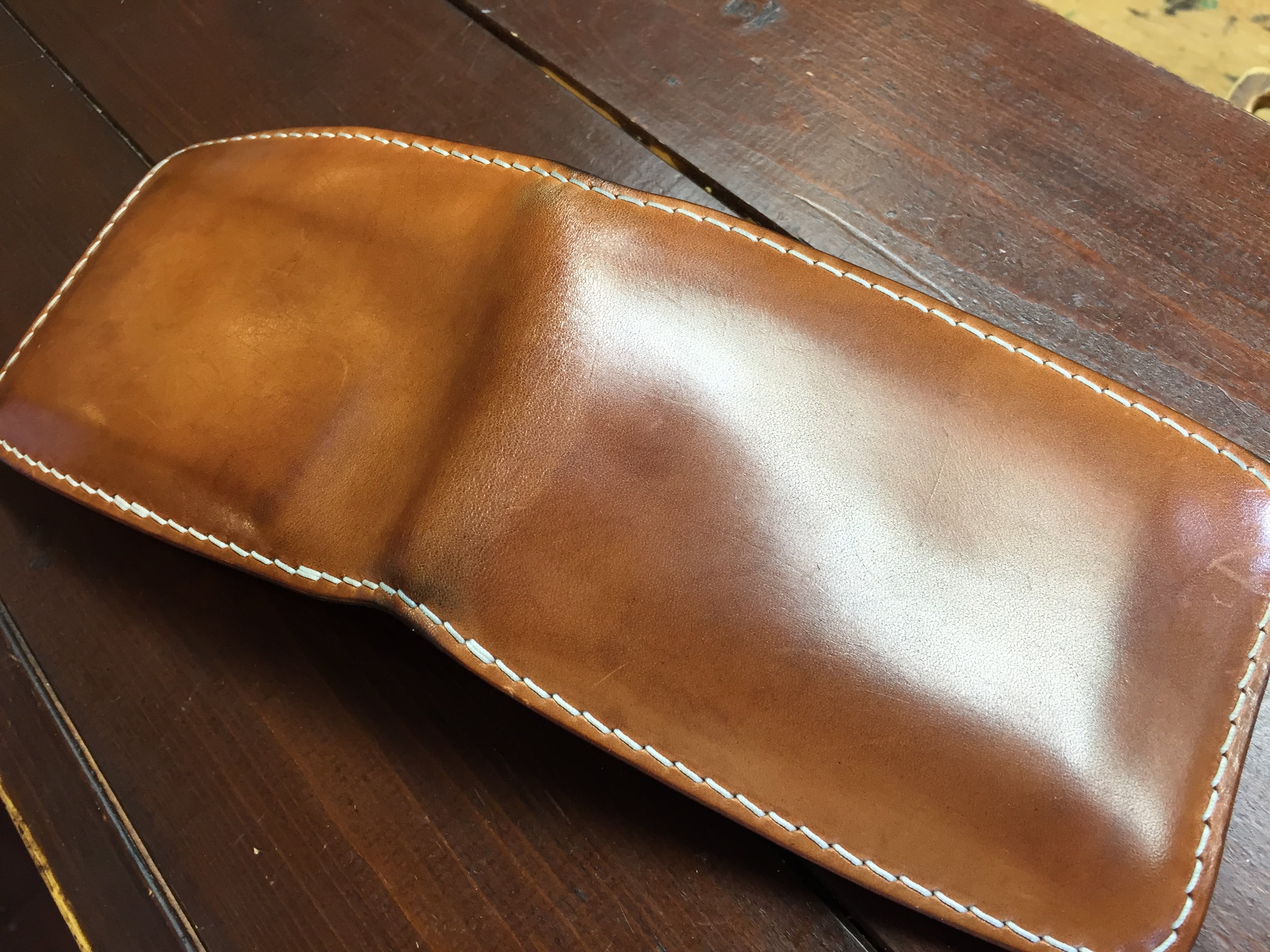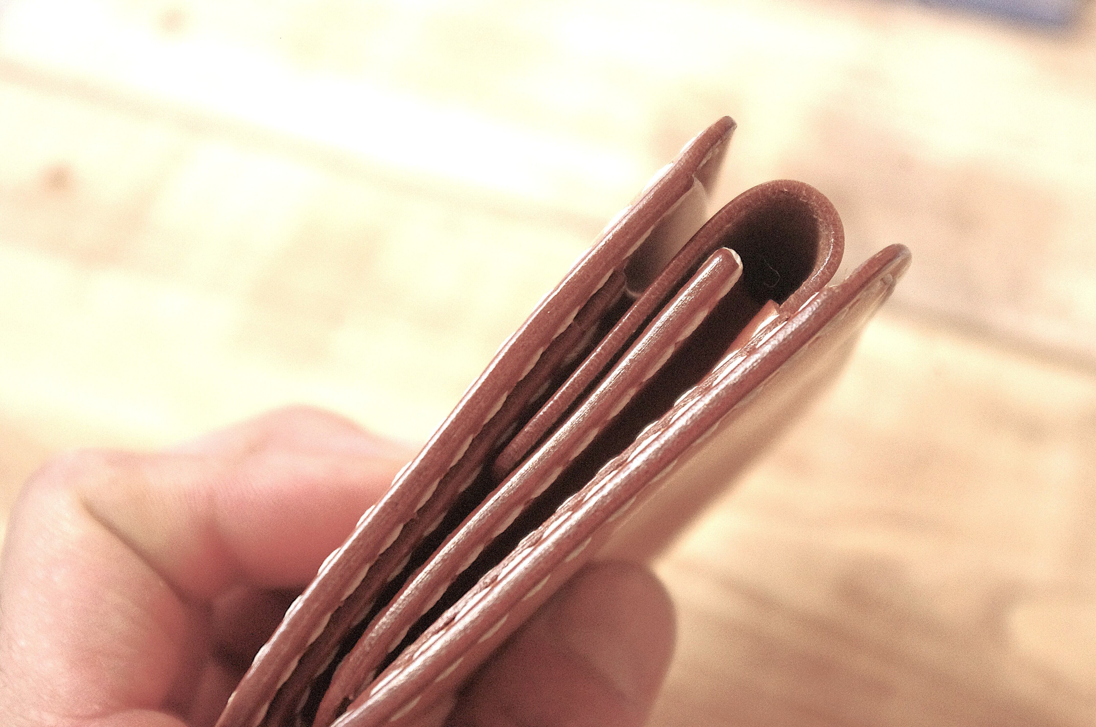 小銭スペースを中央部分にオフセットさせているのでウォレットの端の部分が沈み、中央部分がふくらむ「どら焼き状」になっていきます。