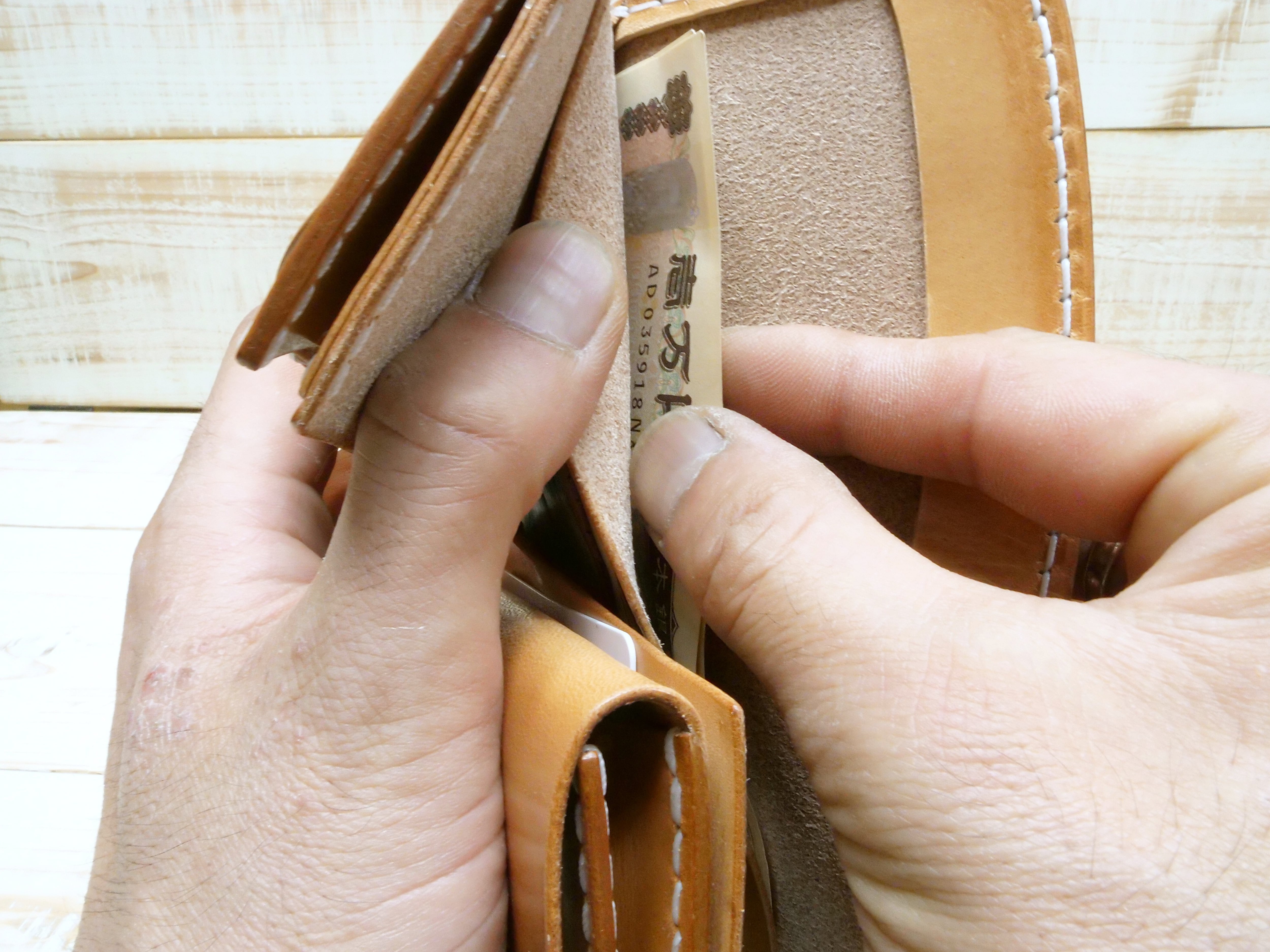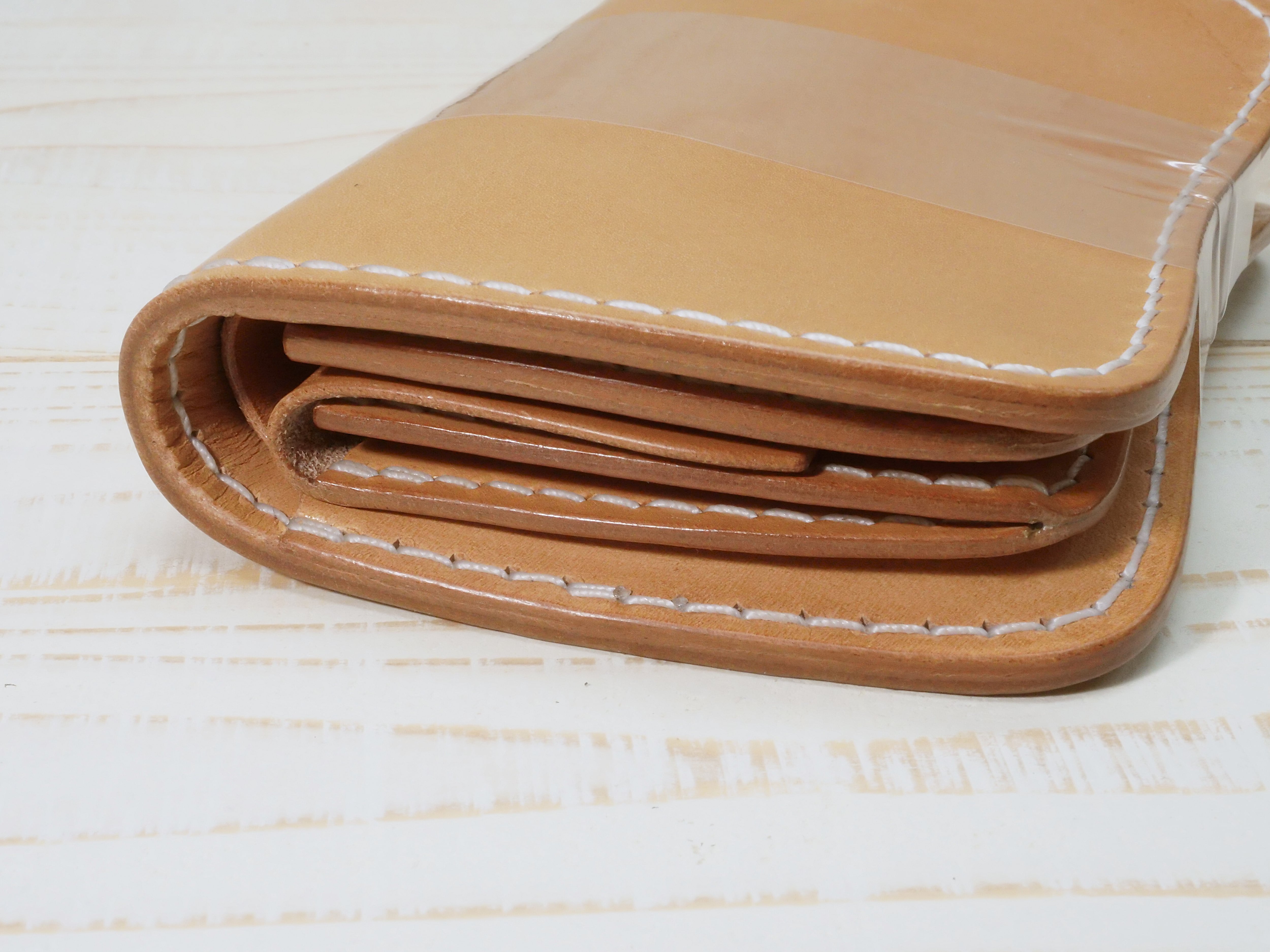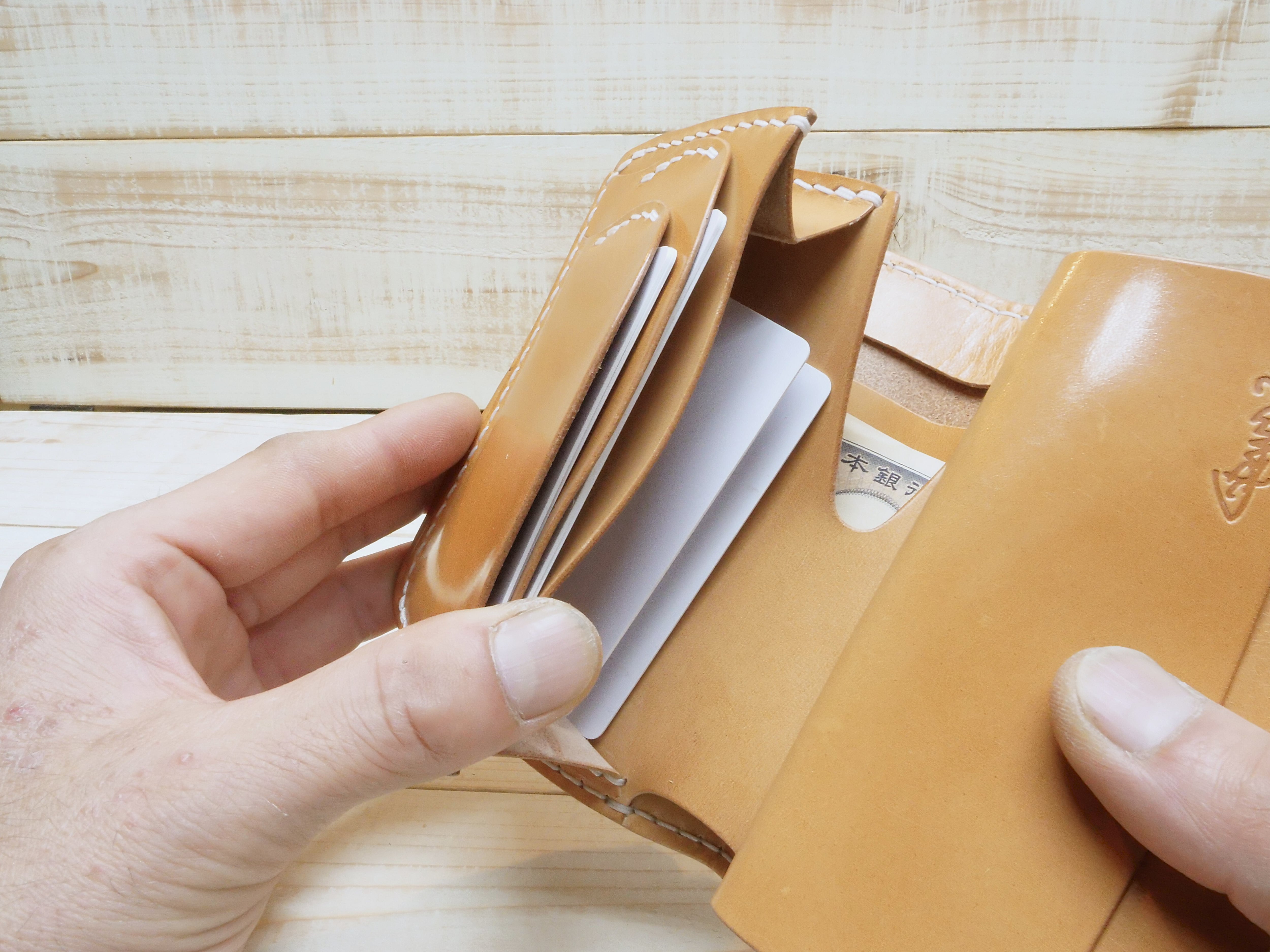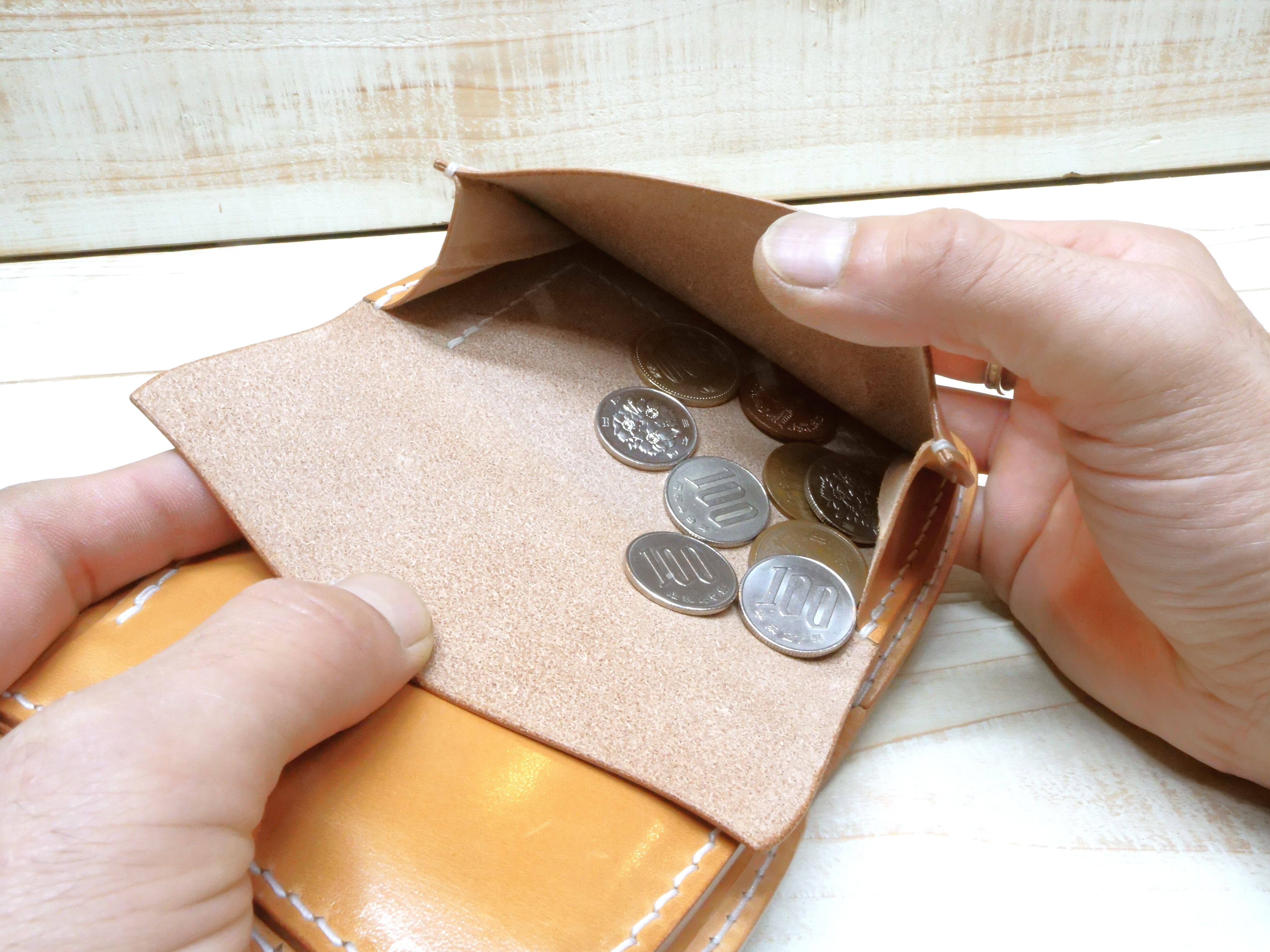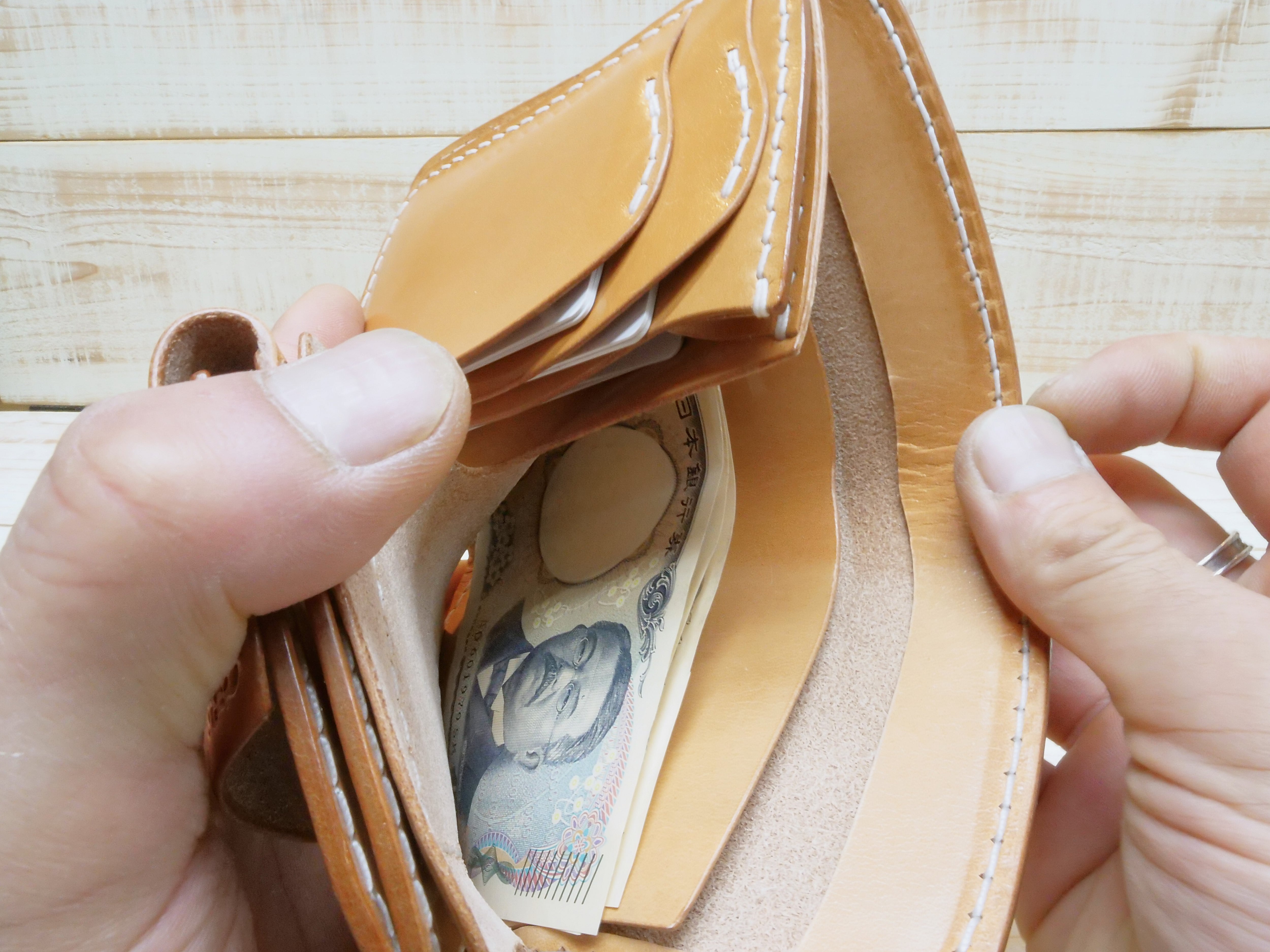 小銭スペースを中央部分にオフセットさせているのでウォレットの端の部分が沈み、中央部分がふくらむ「どら焼き状」になっていきます。