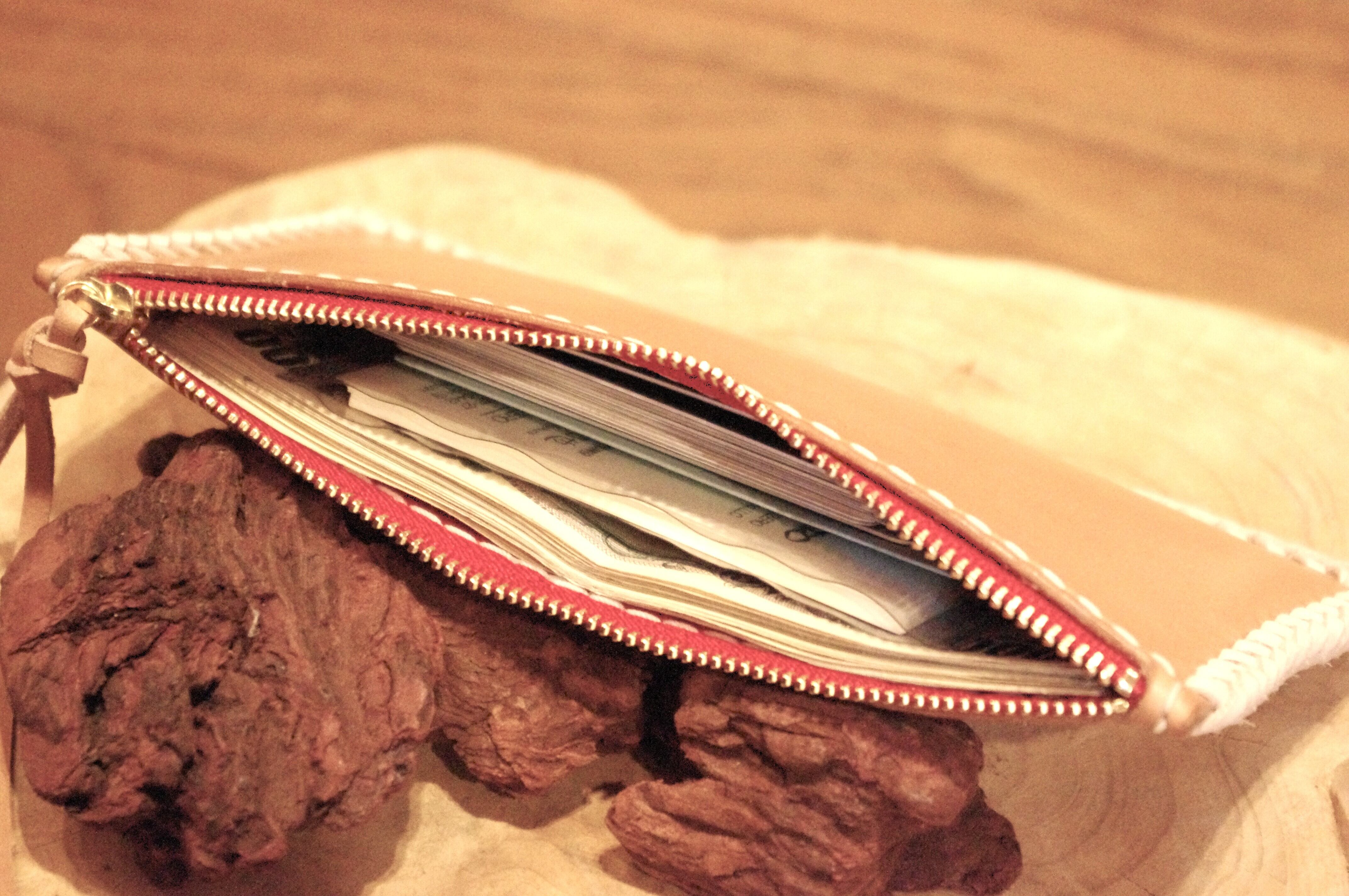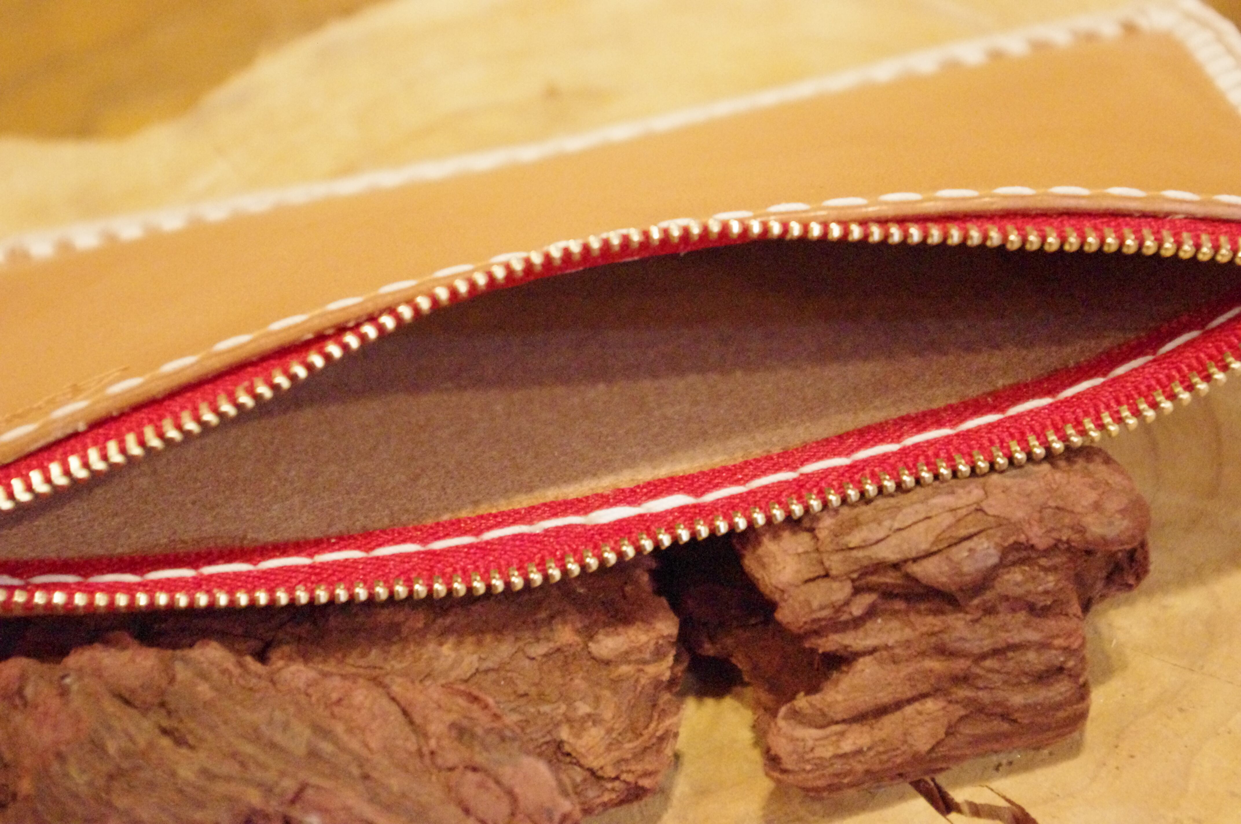 シンプルな機能なのでカンガルーレースのトリプルループでかがったり、赤いファスナーでポイントをつけています。