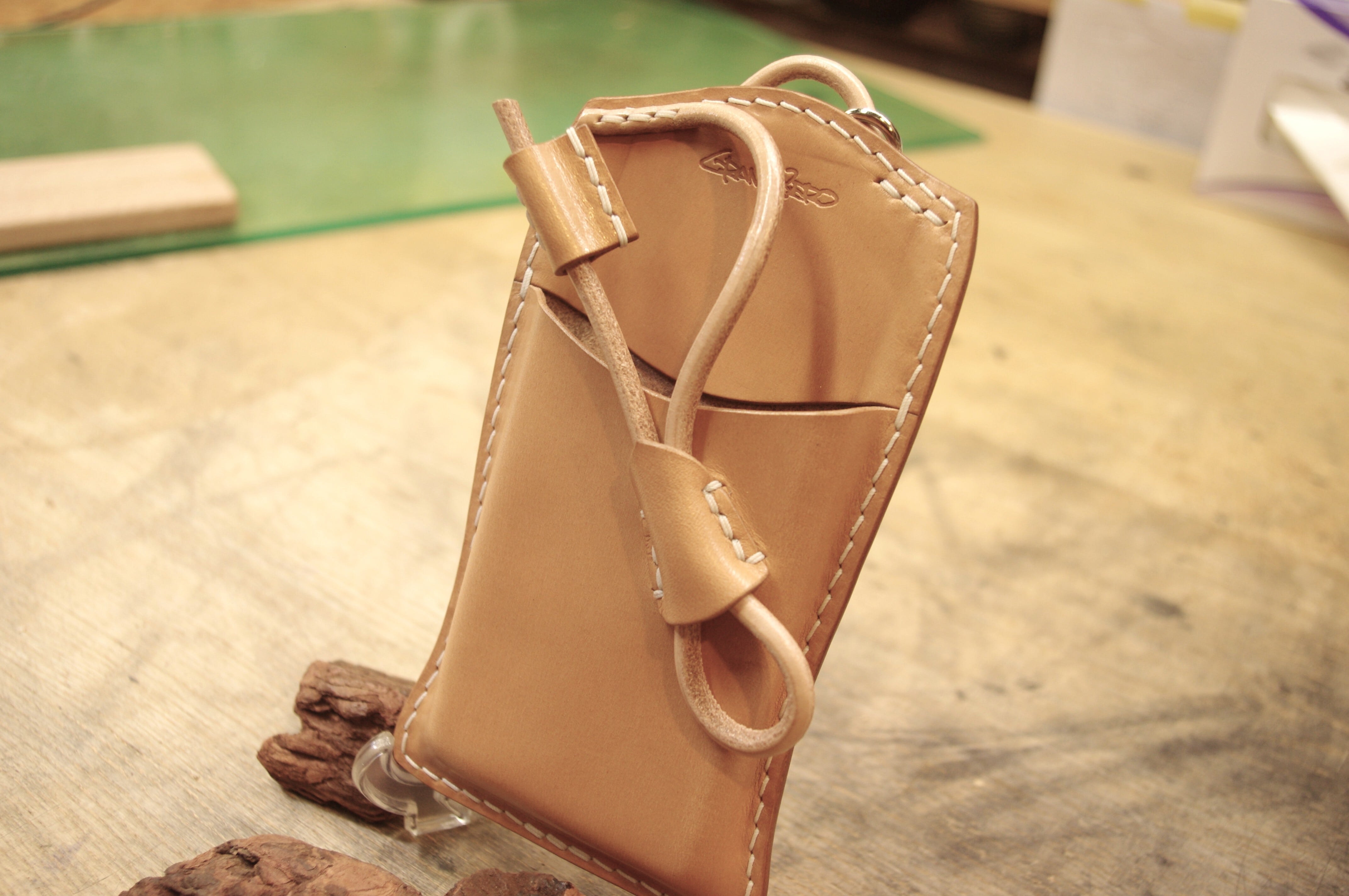 留め具として設定しているのはウォレットにも使っているデザインを踏襲してあり、ぶらっとしてある方を軽くキュッとしていただければ脱落防止になります。