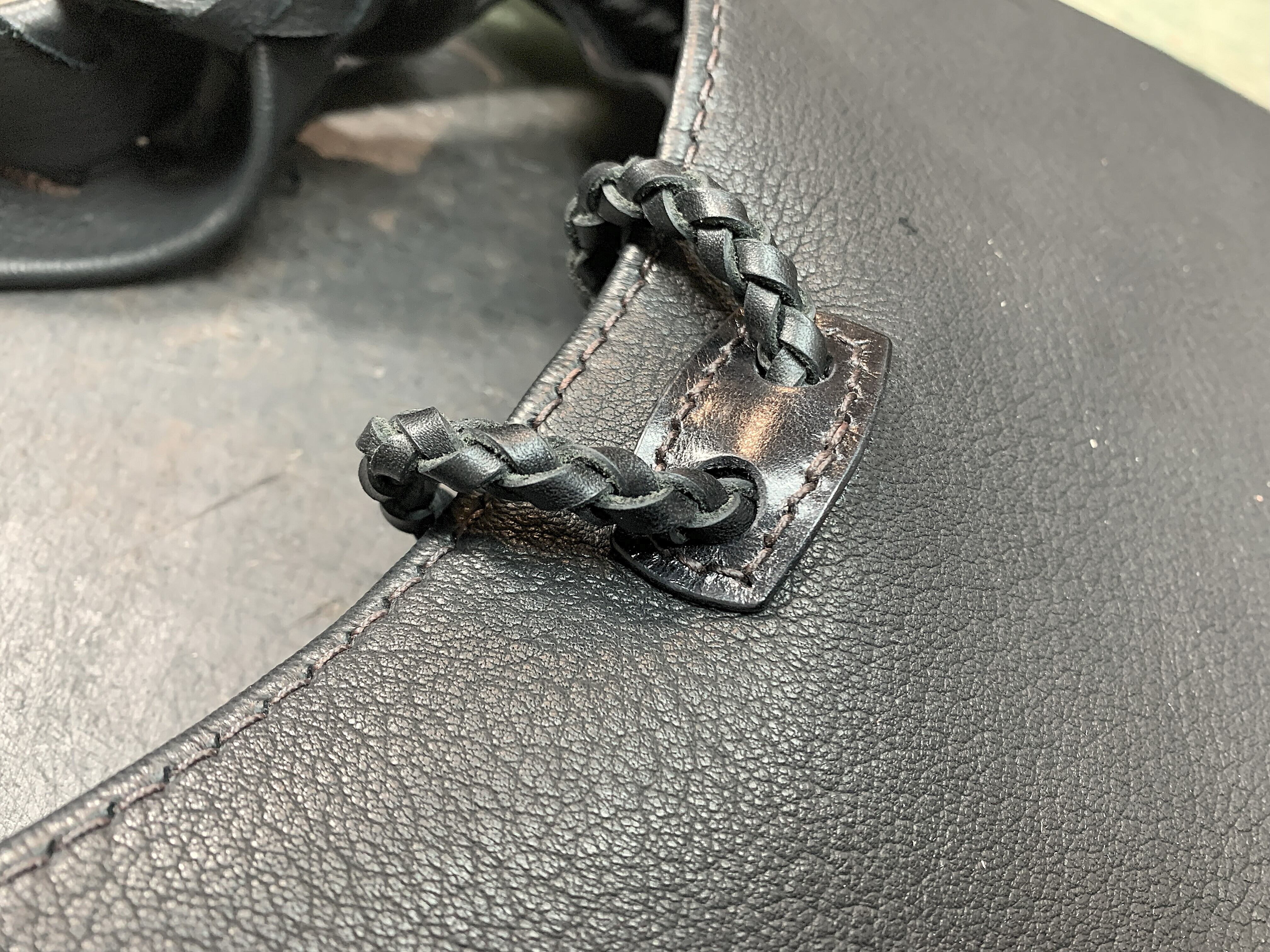 ・ショルダー部分と本体はサドルレザーのパーツで連結(4本編みを8本編みに変換)