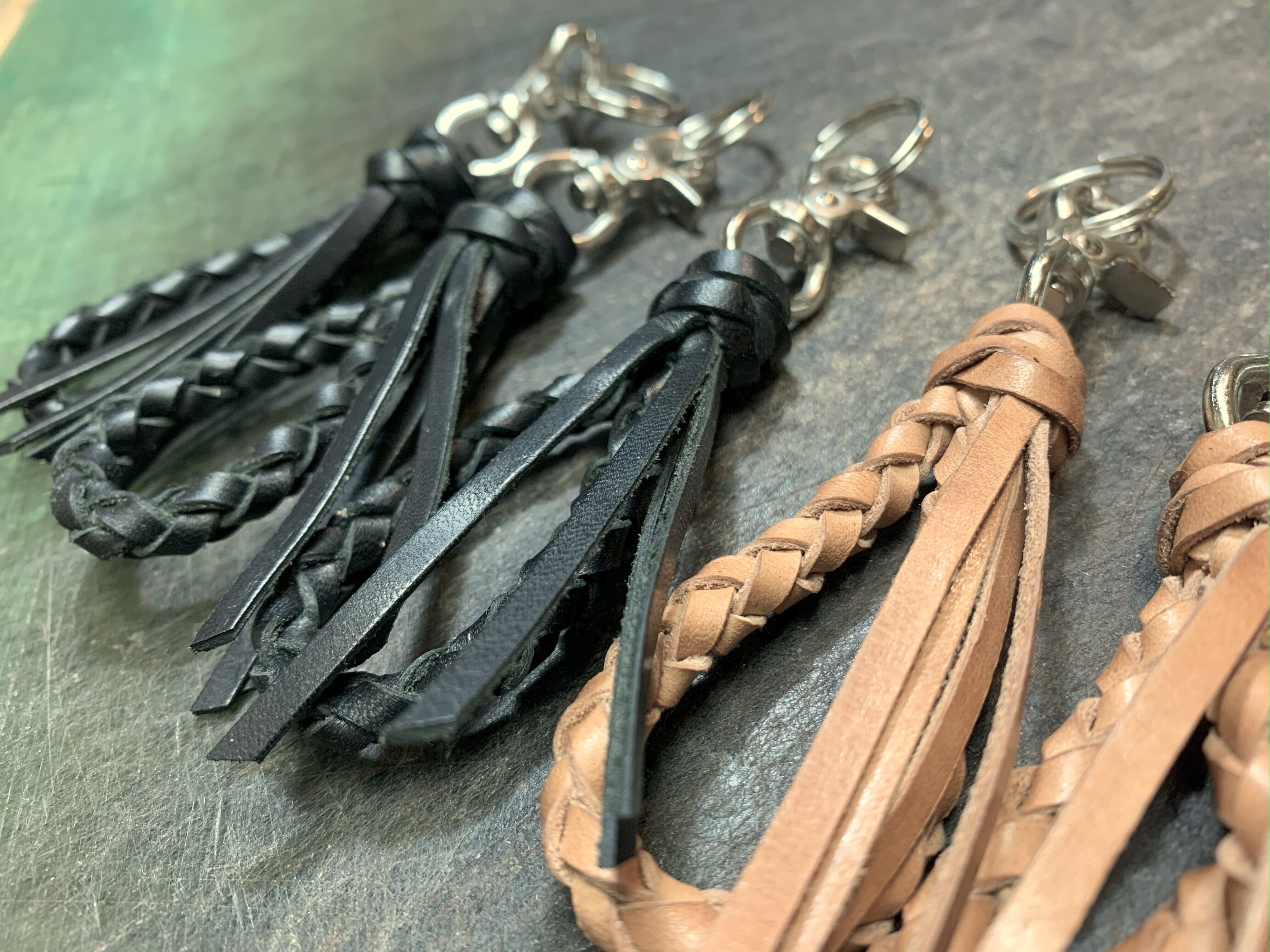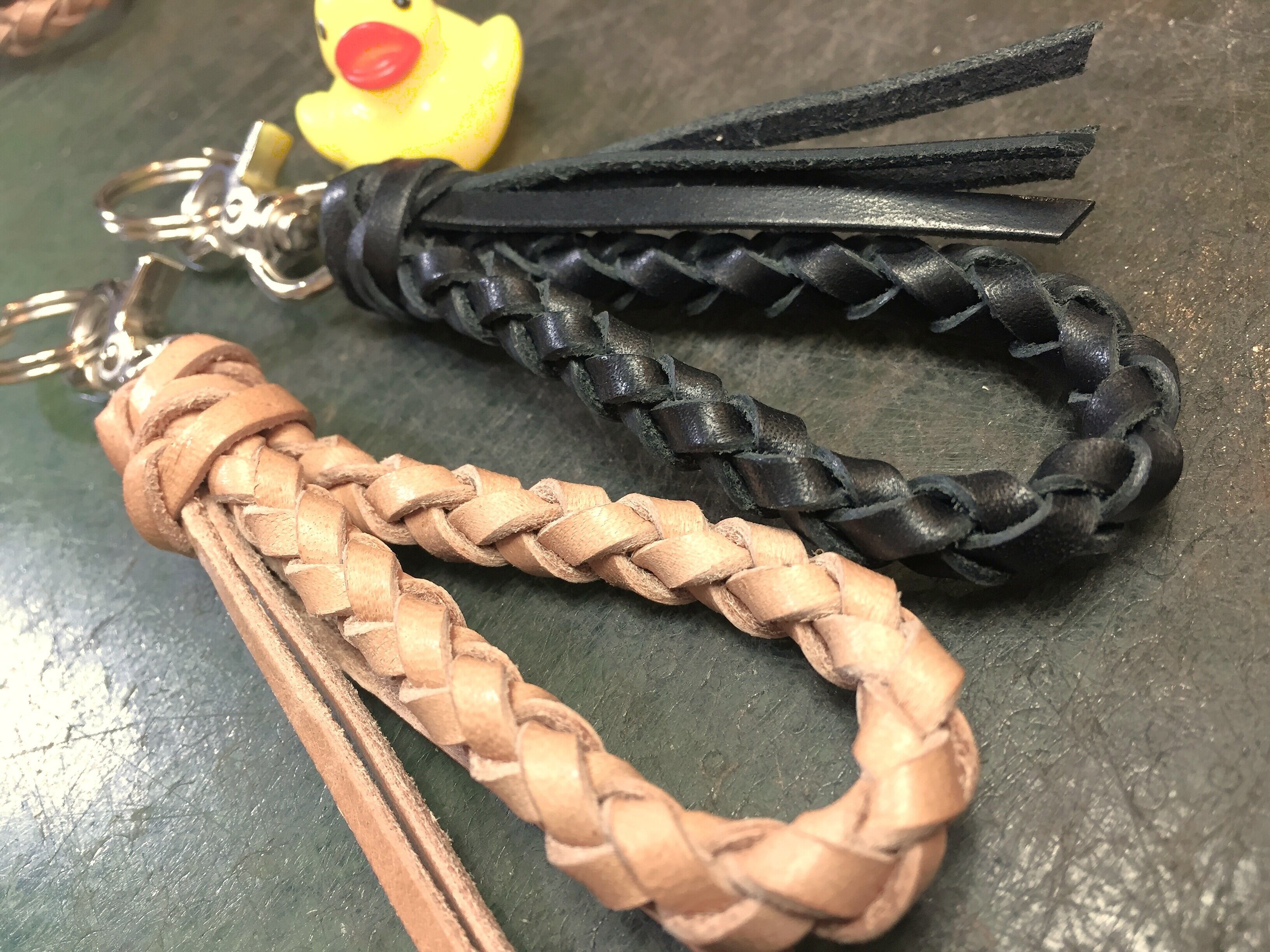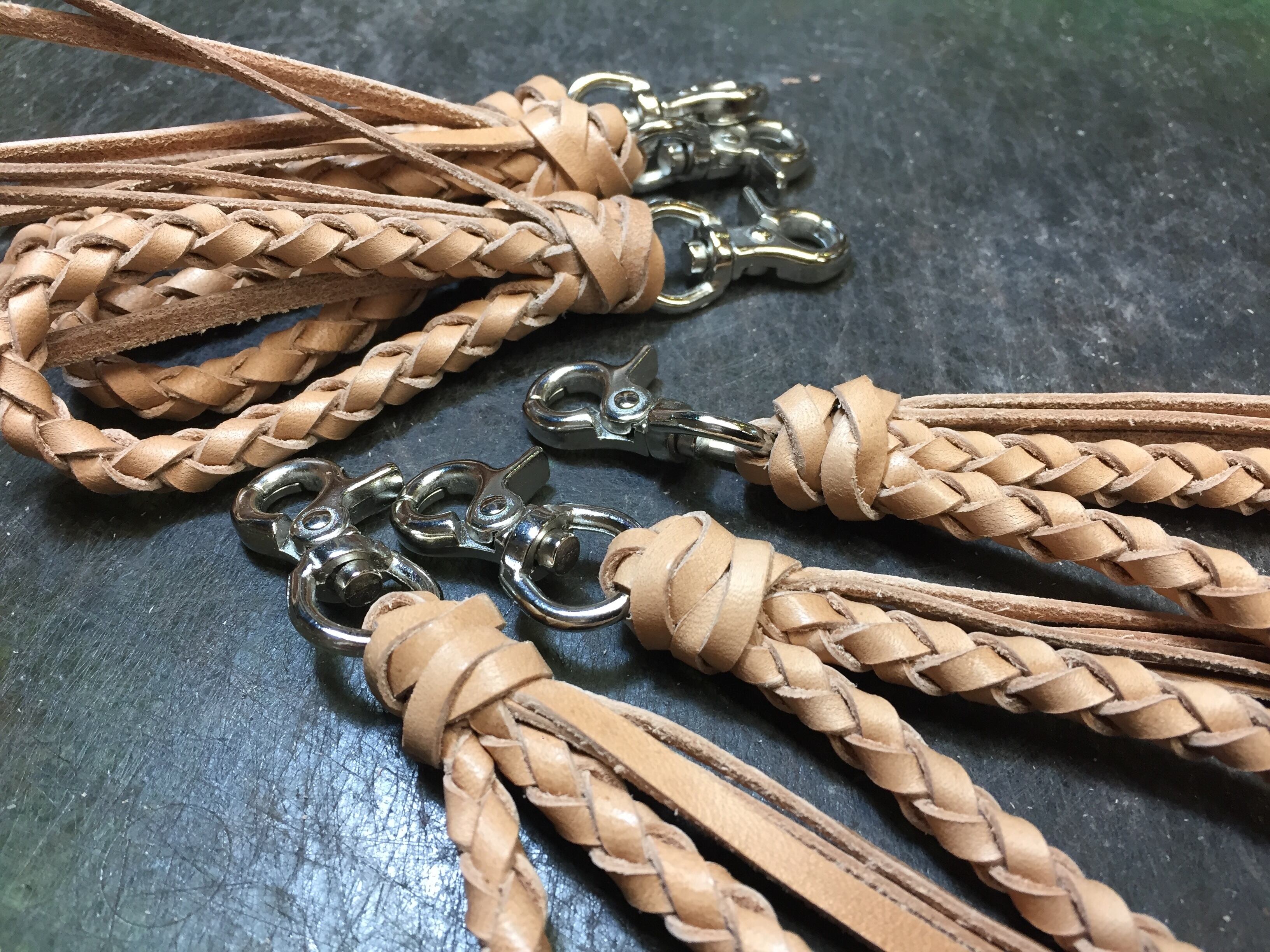 通常ウォレットロープを製作するレースを使い4本編みをし、ループ状に仕上げています。