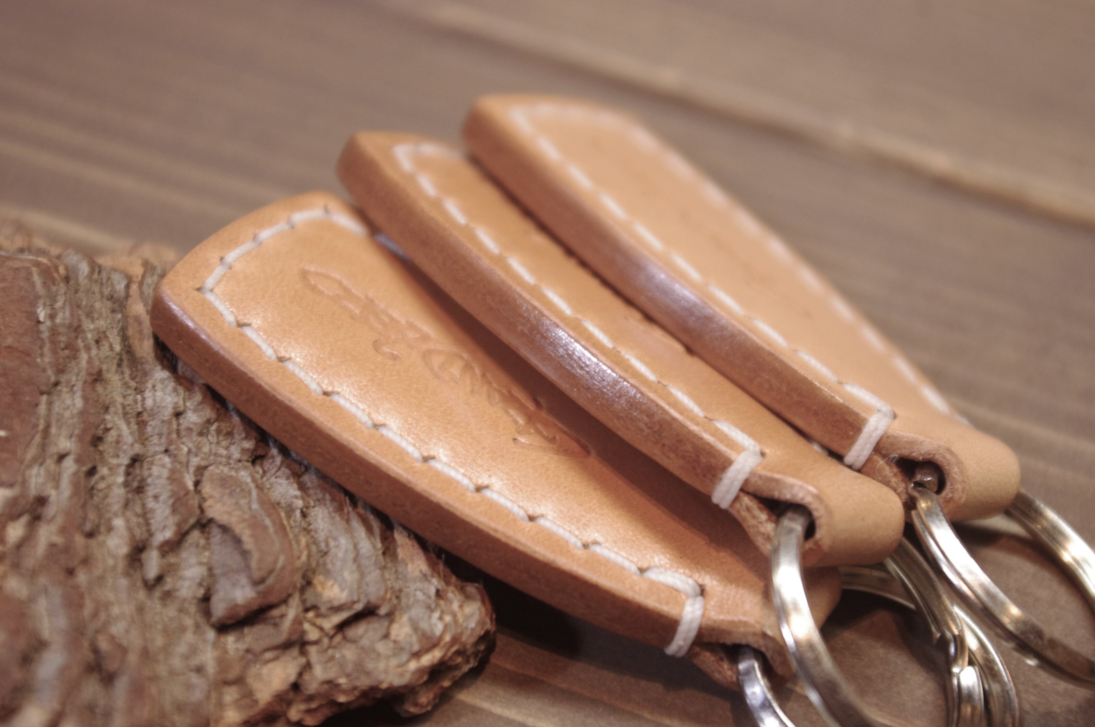 やわらかいイメージを持たせて、ステッチワークとコバ磨きに力を注いだキーホルダーです。